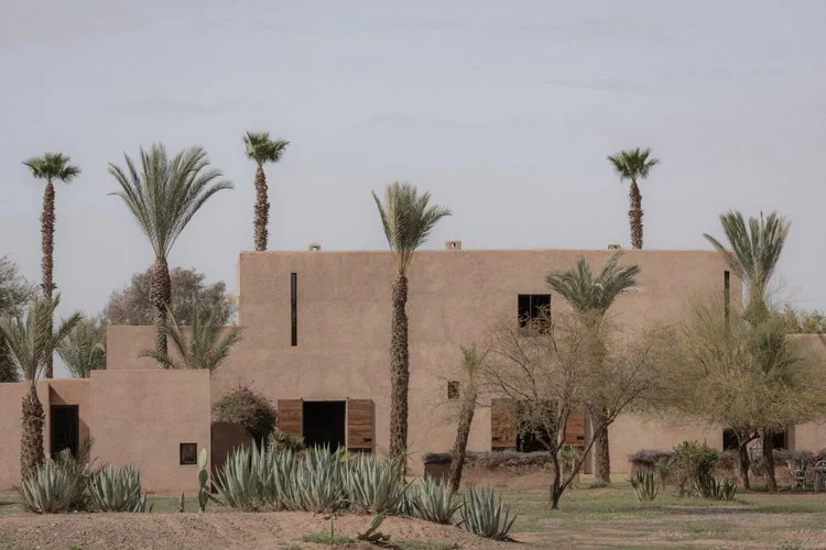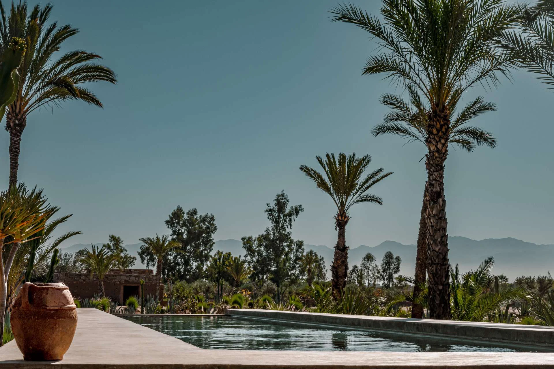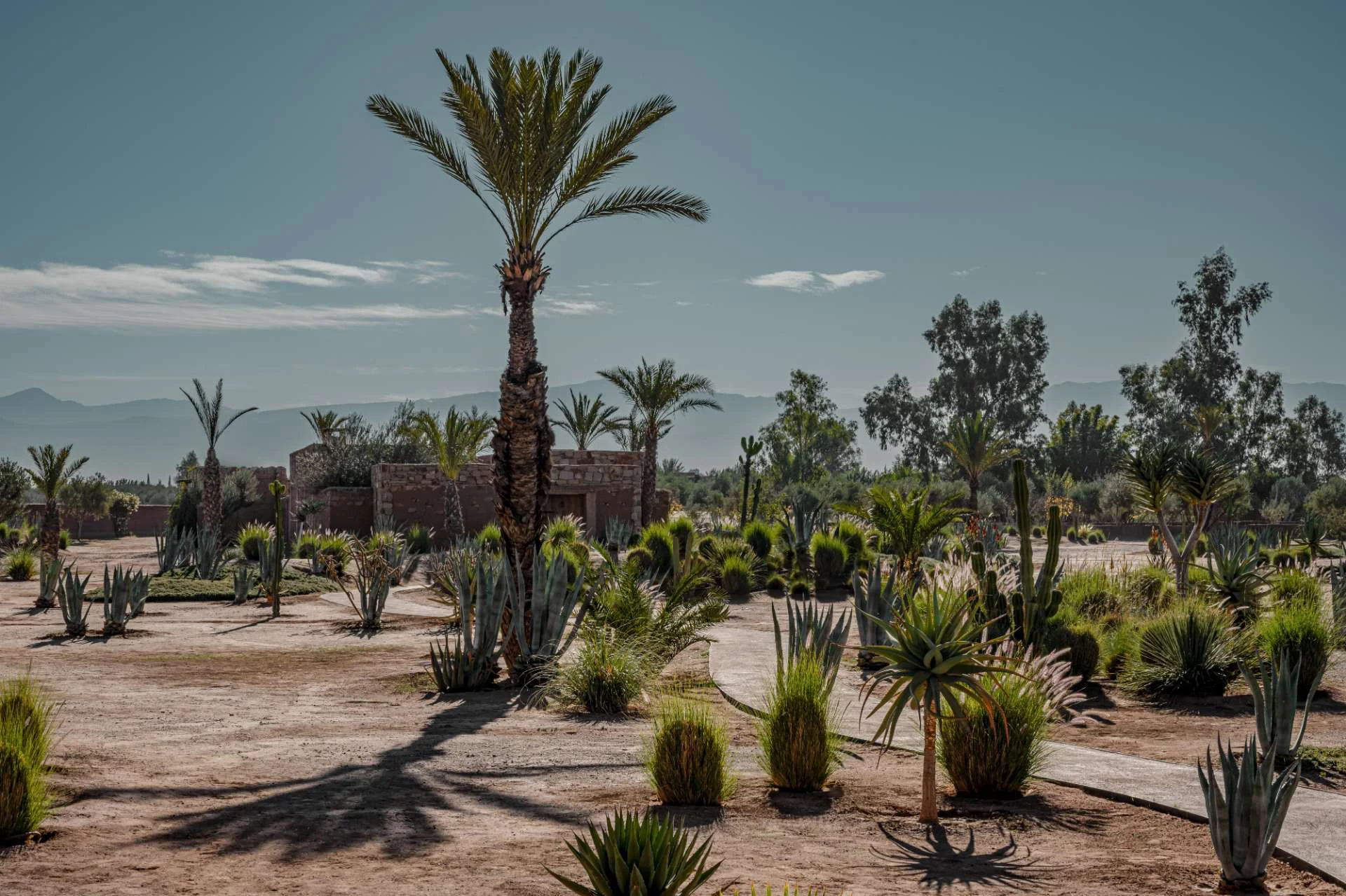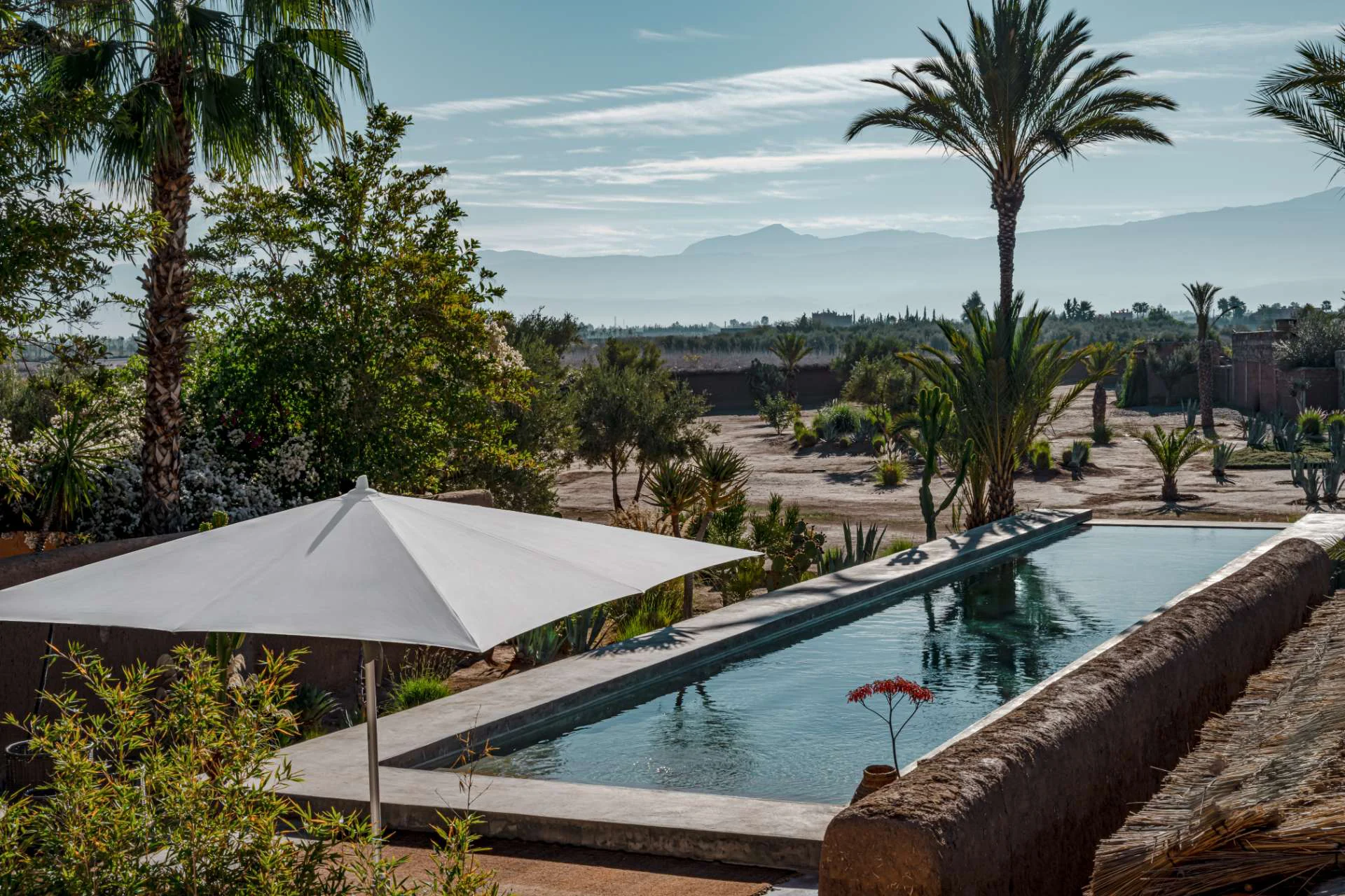 1 MASTER SUITE (100m²)à l’étage, terasse privative, dressing, douche, double vasques, cheminée, king bed double, vue jardins et Atlas.